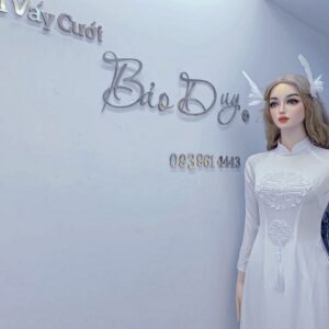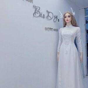 Áo dài trắng tay phồng cổ cao đính hoa vải Tafta