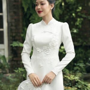 Áo dài hỏi cưới trắng tay phồng đính hoa