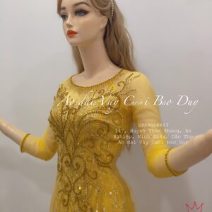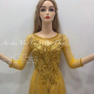 Áo dài mẹ cổ tròn màu vàng đính kết cao cấp