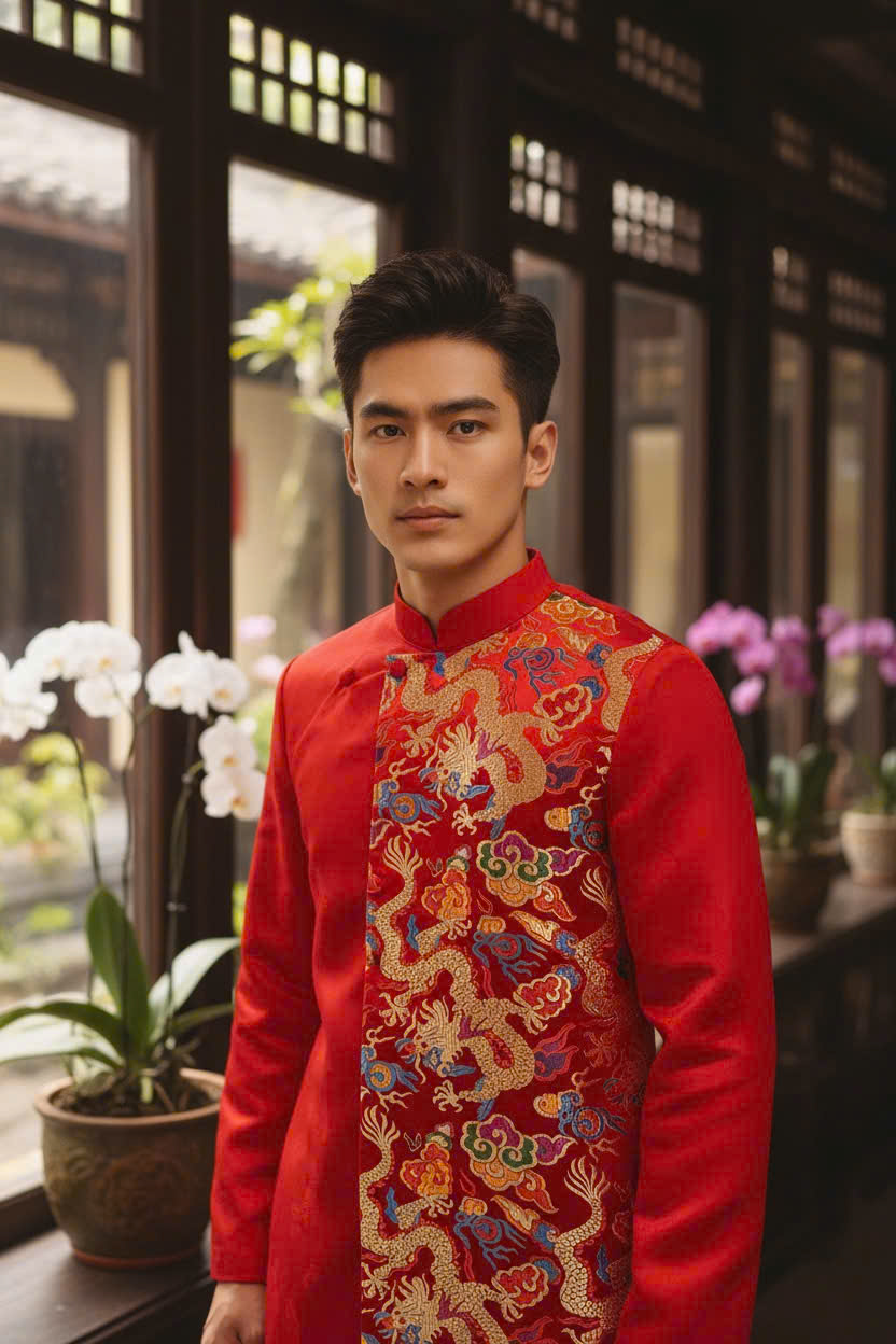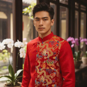 Thiết kế phù hợp mặc Tết, lễ hỏi, đám cưới, chụp ảnh truyền thống, giúp chú rể và quý ông nổi bật đầy bản lĩnh. Form chuẩn nhiều size, có hỗ trợ đo chỉnh theo yêu cầu, tôn dáng lịch lãm.