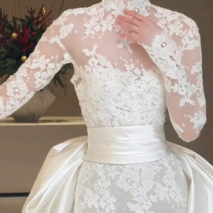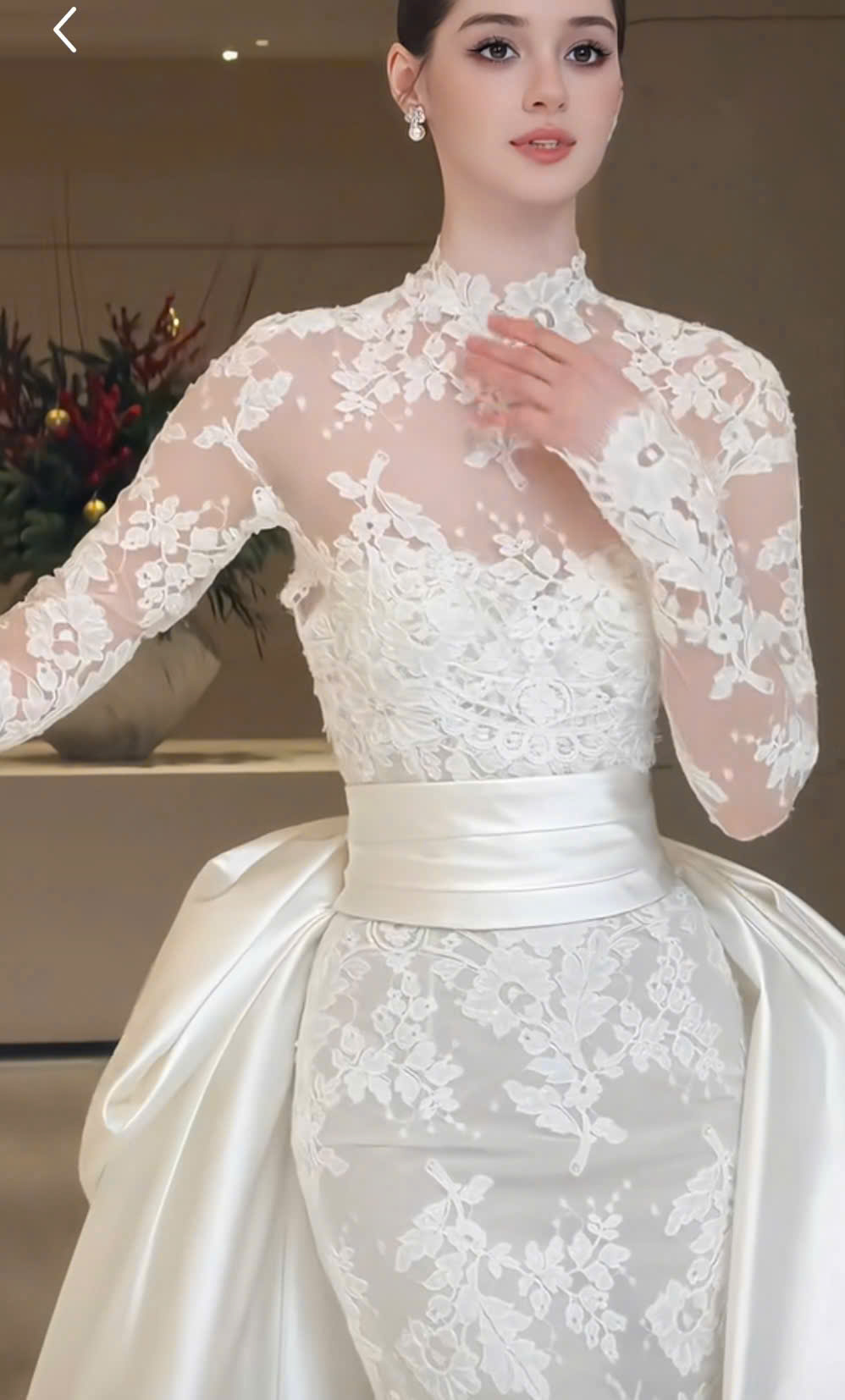 Chất liệu ren cao cấp với nhiều phiên bản ren khác nhau – từ ren hoa nổi tinh xảo đến ren mềm cao cấp – mang đến sự lựa chọn đa dạng theo phong cách cô dâu. Phần cổ cao và tay dài tạo nét kín đáo, quý phái, đặc biệt phù hợp lễ cưới trang trọng, nhà thờ hoặc đại lễ.