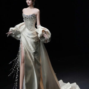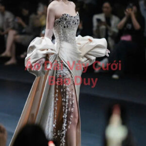 * Phần váy dài có thể tháo rời: Được thiết kế với phần đuôi váy dài thướt tha, lộng lẫy dùng trong lễ cưới chính thức, phần này có thể tháo ra dễ dàng bằng khóa kéo ẩn hoặc cúc bấm tinh tế.